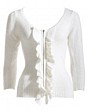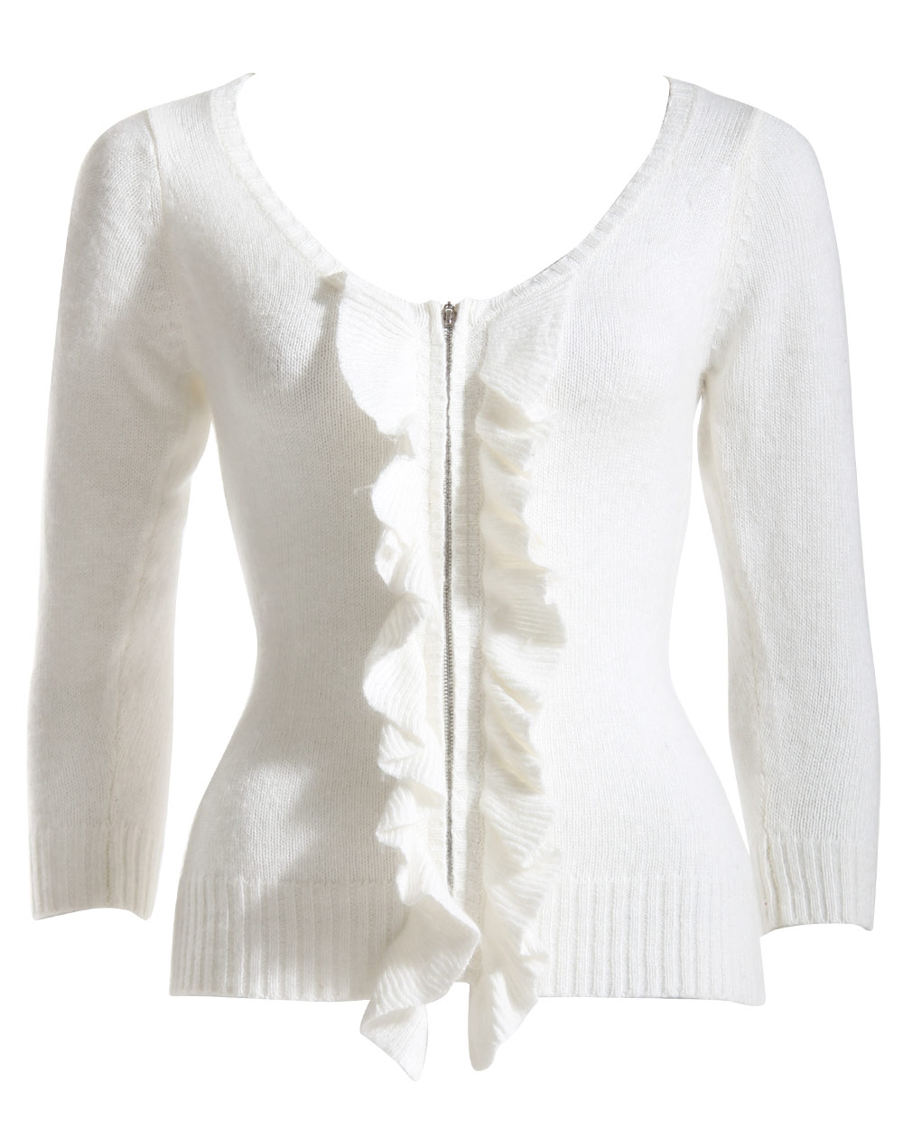 45% viscose, 40% Nylon, 15% angora, 3/4 sleeve cardie. Featuring centre front frill detail and metal zip.