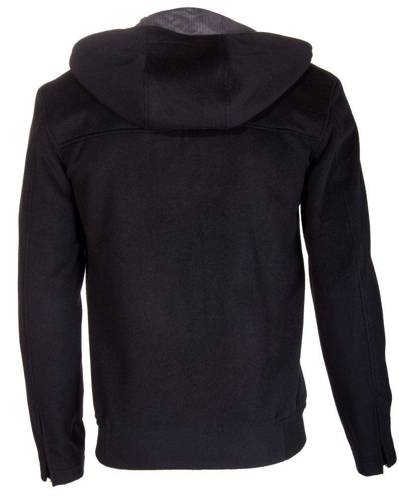 Form fitting melton wool toggle jacket with hood. Designed to fit the body with ease, it tapers down from the shoulders. This jacket is made using premium quality melton wool fabric. It features multi external and internal pockets, three toggle fastenings and side hem rib detail. Made from 100% Wool. Available in black only.