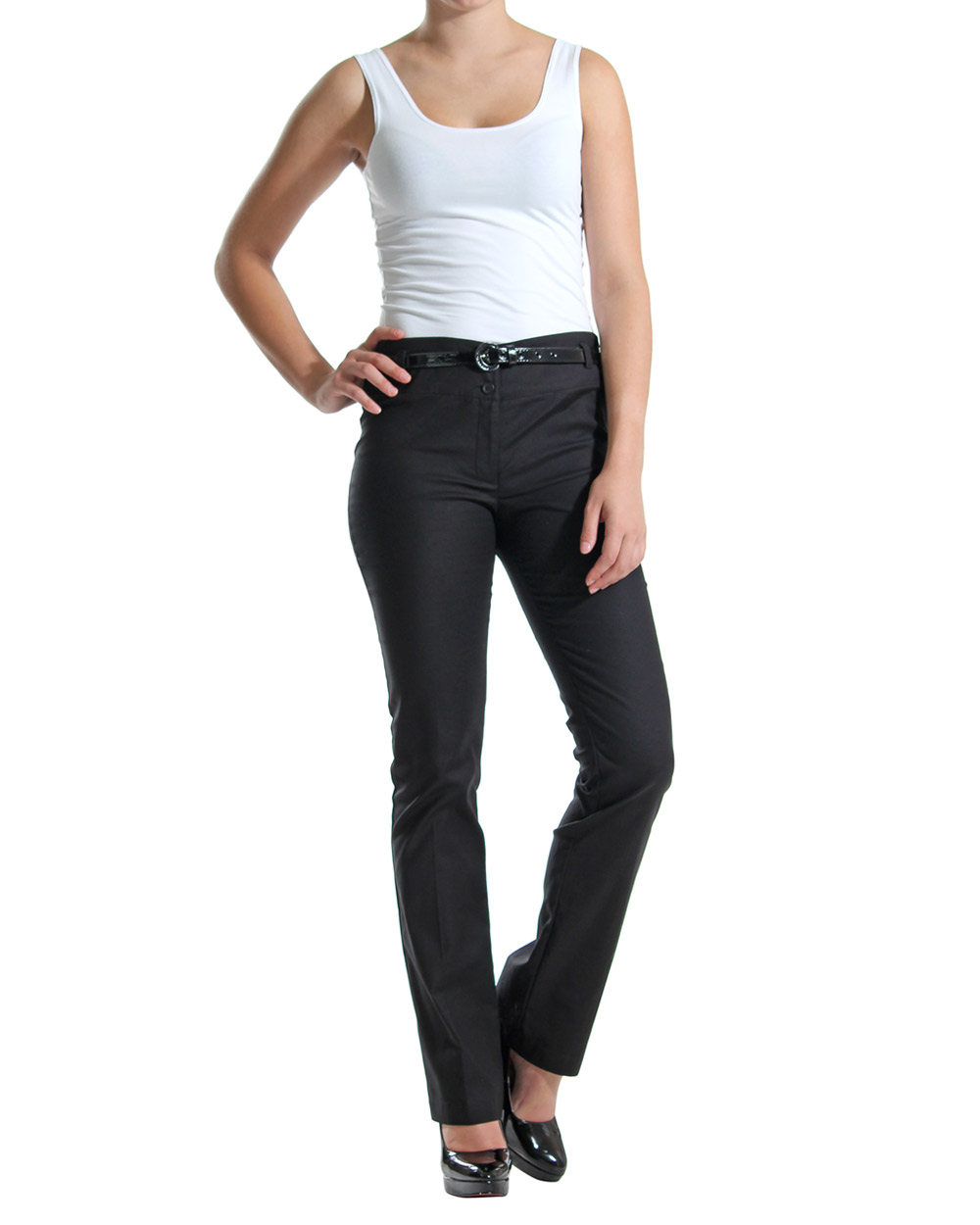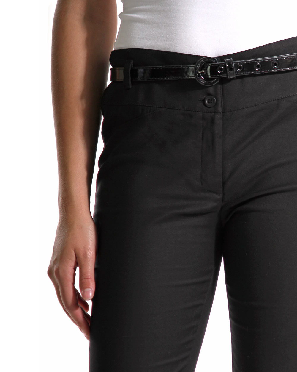 Cotton Elastane trousers, sit's slightly above the hip with a slim fit through leg and boot leg bottom.